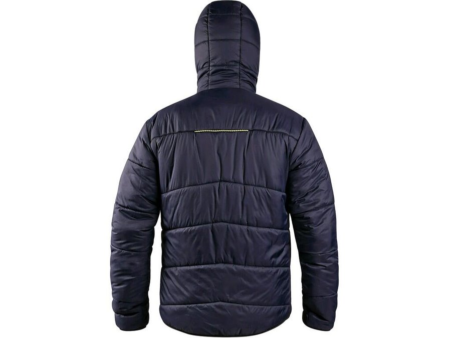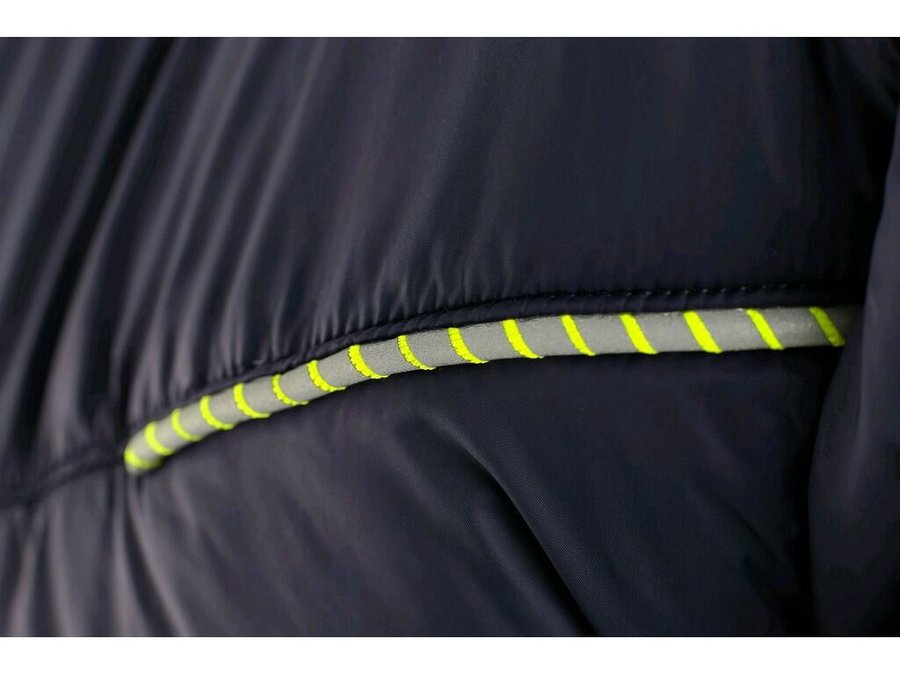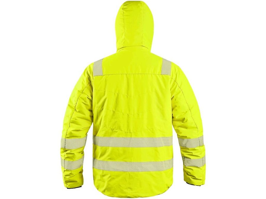 Pánska výstražná obojstranná bunda, zateplená. Kapucňa napevno, rukávy a spodný lem do gumičky. Vrchná časť má náprsné vrecká na zips, bočné vrecká na zips a segmentované reflexné pásky. Vnútorná strana bundy má náprsné vrecko na zips, bočné vrecká na zips, kontrastné žlté/oranžové a reflexné doplnky.
