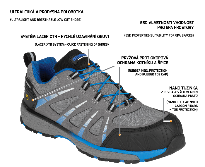 Ultraľahká bezpečnostná obuv s označením S3 vhodná do vnútorných aj vonkajších a taktiež do EPA priestorov. Obsahuje NANO špicu z inovatívneho materiálu z karbónových vlákien, vďaka ktorému špica disponuje veľmi nízkou váhou. Šnurovanie je zaistené pomocou systému Lacer XTR, ktorý umožňuje pohodlné a rýchle uzatváranie topánky. Gumová ochrana päty a gumová okopová špica. Obuv je vybavená gélovou stielkou - hrubá vrstva gélovej výplne v oblasti päty tlmí nárazy, priaznivo pôsobí pri dlhodobom alebo nadmernom zaťažení chodidla.