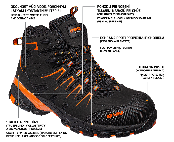 Nemetalická bezpečnostná členková obuv v prevedení S3, ktorá je odolná voči vode, pohonným hmotám aj kontaktnému teplu do teploty 300°. Dobrú stabilitu vám pri pohybových aktivitách zaistí podošva s protišmykovou SRC vlastností, pohodlie umocní odpruženie v oblasti päty, ktoré absorbuje nárazy spôsobené chôdzou. Bezpečnostnými prvkami, ktoré vaše chodidlá ochránia pred mechanickým poškodením, sú kompozitná špica chrániaca prsty a kevlarová planžeta zabraňujúca prepichnutiu vášho chodidla a ďalej tiež reflexné prvky v oblasti šnurovania, ktoré zaistia, že budete vidieť za úsvitu za tmy aj šera. Táto obuv je vhodná do náročného pracovného prostredia.