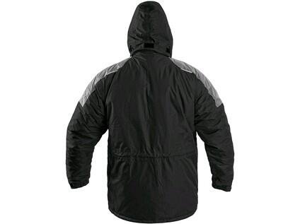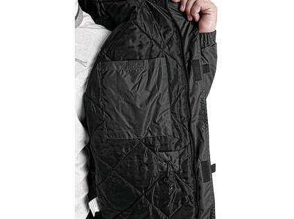 Zateplená bunda, odolná proti vode a vetru, kapucňa v golieri, rukávy zakončené regulovateľnou manžetou, sťahovanie v páse, lepené švy, 4 vonkajšie vrecká na zips kryté légou.