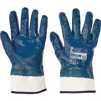 Rukavice šité z bavlneného úpletu, celomáčené v nitrilu, s tuhou manžetou.
