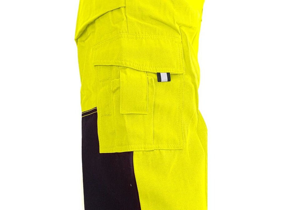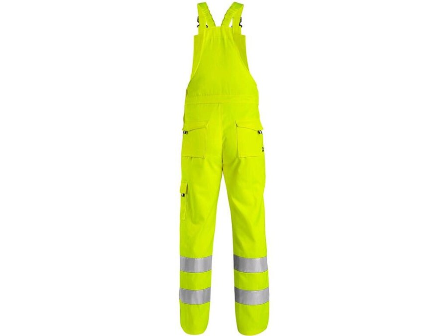 Pánske nohavice s náprsenkou, výstražné, v zadnej časti pása guma na stiahnutie, našité vrecko na náprsenke s vreckom na ceruzku, predné a zadné našité vrecká, bočné vrecko s vreckom na mobil, reflexné pruhy 3M.